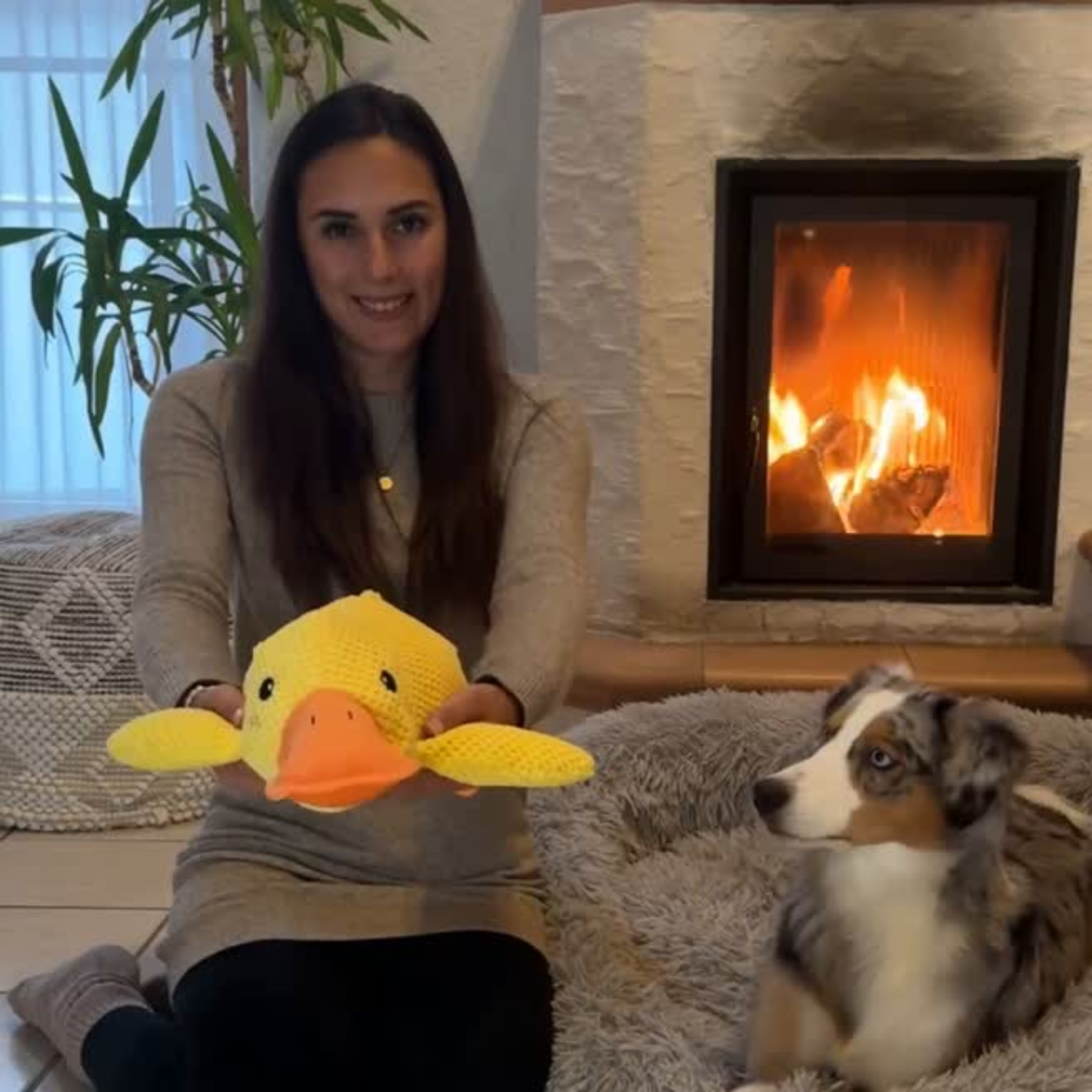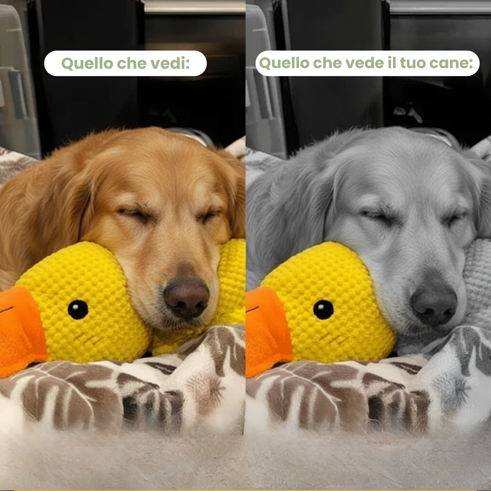 "Il mio cane era molto stressato dal tuono. Ora si rannicchia contro il suo anatroccolo e rimane molto più sereno. Una bellissima sorpresa!"